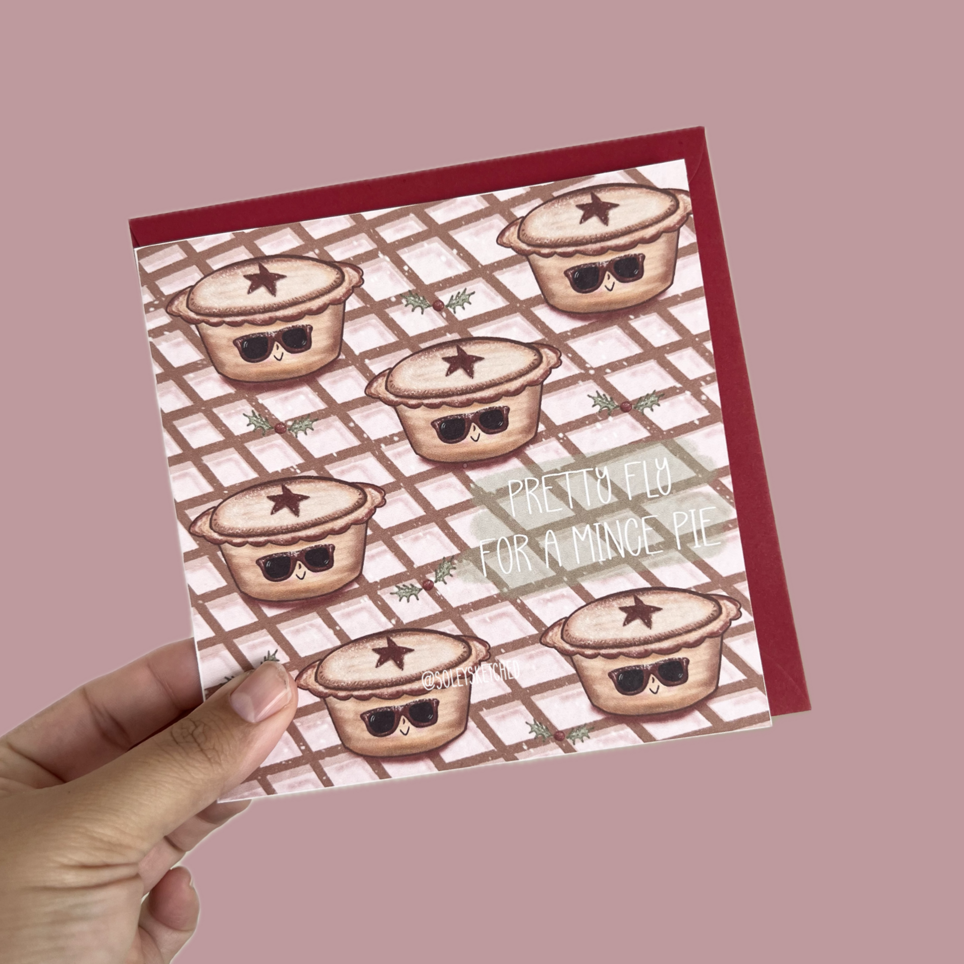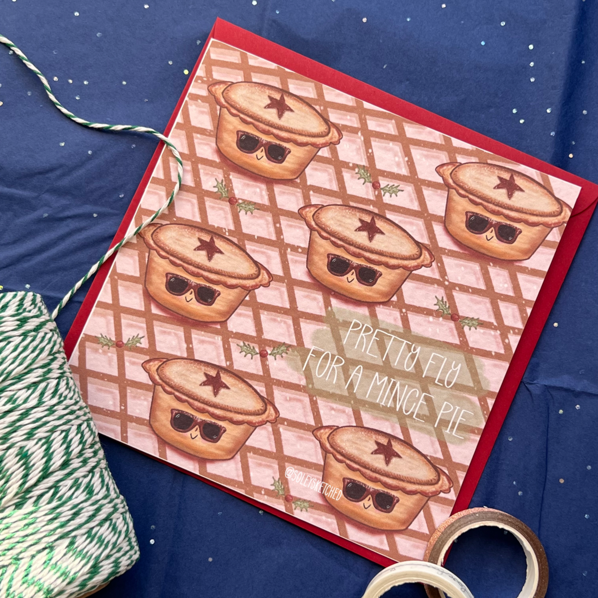 Add a cheeky twist to your festive greetings with the "PRETTY FLY FOR A MINCE PIE" card. Featuring a playful tray of mince pies sporting cool sunglasses, this card brings fun and charm to holiday celebrations. Perfect for spreading smiles and holiday cheer, it’s a unique way to say you're "pretty fly" for the season’s favorite treat. Make your festive messages stand out with this cleverly designed card that combines humor and holiday spirit.